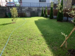 昨年以上に芝生の手入れを頑張っています。写真は7/24時点の芝生の状態。青いホースの先にスプリンクラーがあります。猛暑なのでスプリンクラーにタイマー(時間になると水やりができる。雨が降ると停止する)をセットして水やり、スプリンクラーが届かないところを手動で水やり、コマメな雑草取り、掃除、芝刈りとやる事が結構あります。