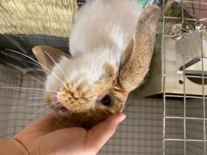 それでも4隅が芝生の生育がイマイチ。春先に土の入れ替え、芝生の張替えもしたのですが、どうしてもバラツキが出てしまいます。8月様子見て業者さんに相談したいと思いますが、この1ヶ月は自力で頑張ってみます。もう一枚の写真はうさぎホテルのお泊りした時に店員さんに撫でられているぷに店長。人見知りしないみたいです。