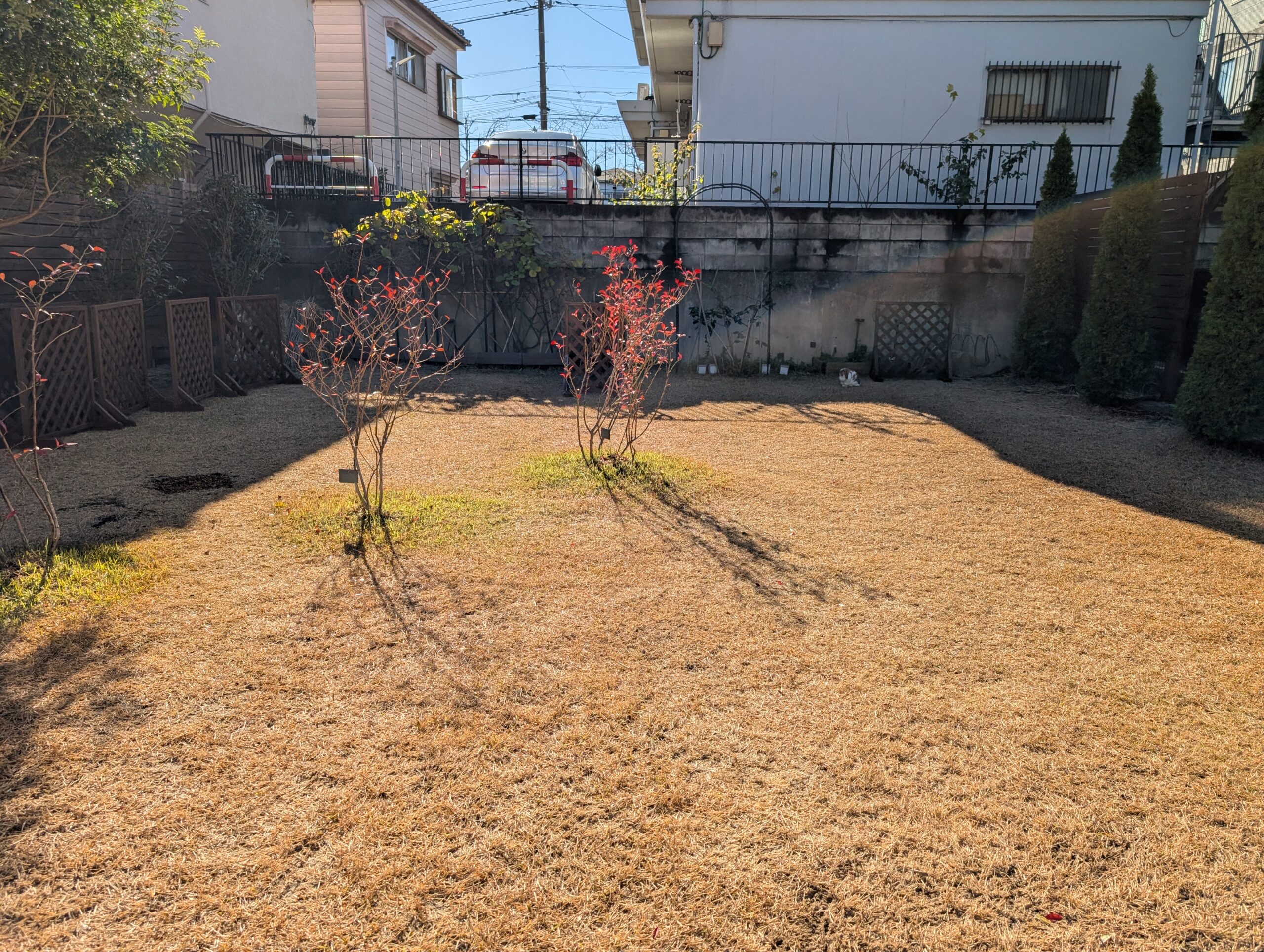 今日は会社休み取ってブルーベリー木の移動作業。先週週末に移動先の穴掘り、土壌改良(ブルーベリーは多くの木と異なり、酸性土壌が必須。)を行い、今日はその移動作業。中央に3本ブルーベリーを植えていたものの一番右側を移動。↓の写真が移動前、移動後(穴が空いている)、移動後(穴埋め、芝生再度貼り直し)。1月-2月にプロの方に依頼して、真ん中にフェンスを設置予定。今まで可動式のラティスフェンスを使っていましたが、風で倒れる、耐久性の課題、隙間の調整が大変など、いつか変えようと思っていましたが、プロの方のデザインが素敵につきお願いする事に。来年春には完成見込みです。