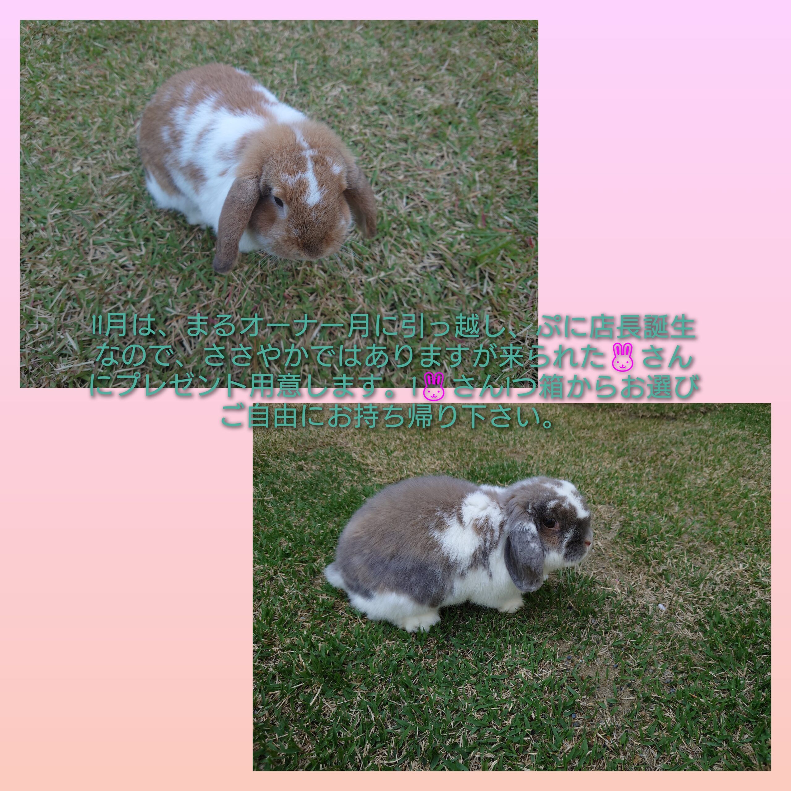 お陰様で大きな問題もなくラビットラン運営が2年目を無事終えようとしており、何よりです。11月は、まるオーナーのお月様への引っ越し、ぷに店長誕生月ということでささやかではありますが、11月ラビットランに来られた方にプレゼント用意しました。箱にプレゼントありますので、1うさぎさん1つお好きなモノをお持ち帰り下さい。元気で長生きを祈っています。 by まるオーナー & ぷに店長